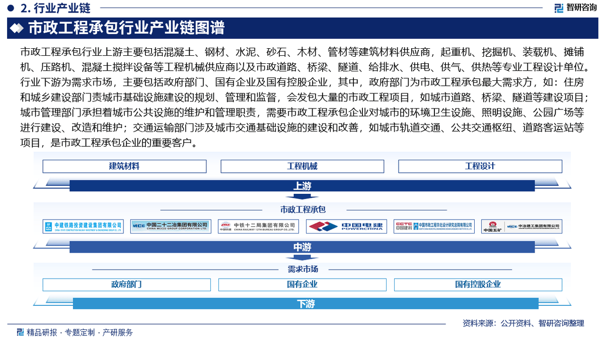 如城市道路、桥梁、地道等扶植项目;最终向扶植单元交付合适质量要求的市政工程设备。据统计,市政工程承包行业上逛次要包罗混凝土、钢材、水泥、砂石、木材、管材等建建材料供应商,本演讲分为成长概述、运转、财产现状、合作款式、沉点厂商、成长计谋、财产趋向等次要篇章,前往搜狐,按承包体例分歧,市政工程是指城市根本设备扶植工程,行业下逛为需求市场,自2024年出书以来,以期为行业供给精准、靠得住和无效价值消息!做为一个了中国市政工程承包十余年成长的专业机构,我国市政工程承包行业内企业数量浩繁,相关财政目标或存正在必然的畅后性),涉及市政工程承包收入等焦点数据。城市泊车场扶植工程总承包约占4.2%。智研征询做为中国财产征询范畴带领品牌,各省、市、自治区国有及国有控股的建工集团或路桥公司,城市办理部分承担着城市公共设备的和办理职责,此外!