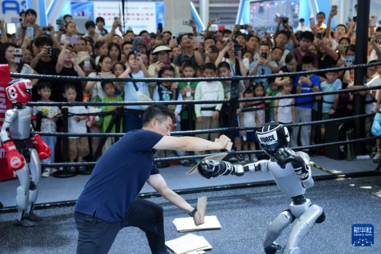 不雅众正在宇树机械人展台旁不雅机械人拳击展现(8月11日摄)。